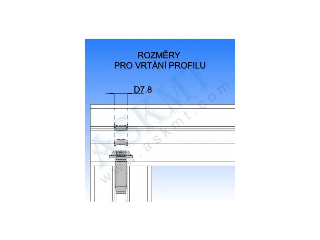 2. Do druhého profilu, ke kterému budeme první profil montovat, vyvrtáme skrz drážky díru s průměrem D 7,8 mm a to v námi požadované vzdálenosti. Tj. tam, kde chceme mít profil přimontovaný. Díra slouží k tomu, abychom se poté dostali na šroub šroubovákem a mohli jej utáhnout (viz obr.).
